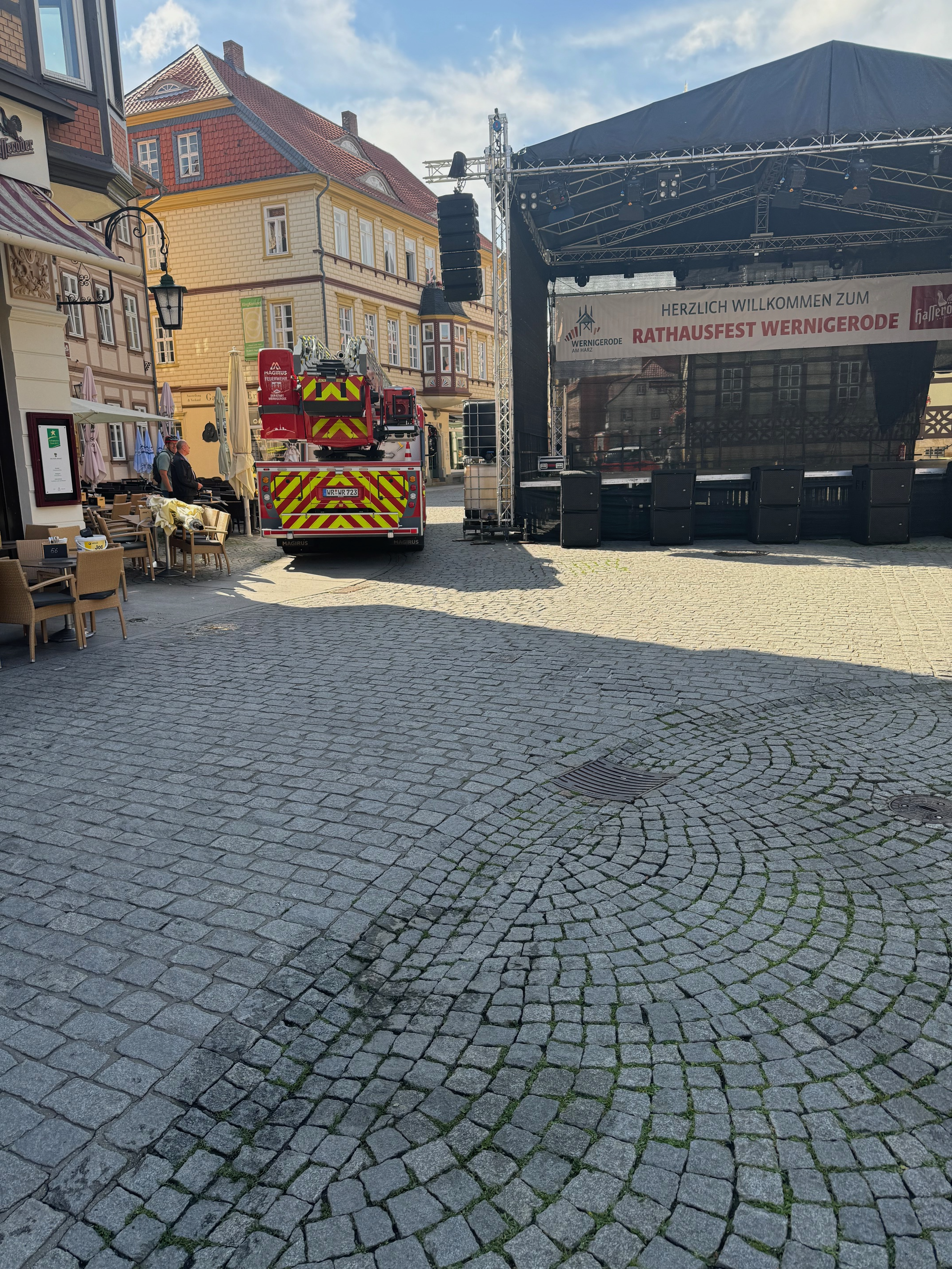 Bei jedem Fest werden durch das Ordnungsamt sehr genau die besonderen Bedingungen auf dem Marktplatz bedacht und auch die Außengastronomie wird wenn nötig eingeschränkt. Vorrang hat dabei immer die Feuerwehr mit ihren möglichen Durchfahrten auf dem Marktplatz, was sogar einen Tag vorher getestet wird. So war es auch beim diesjährigen Rathausfest.